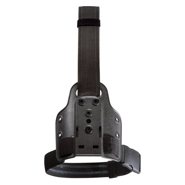 The 6004-10 is a single strap leg shroud. It features a 2” (50mm) elastic leg strap and a 2” (50mm) adjustable vertical web strap which attaches to the belt. Its small size allows for a lower profile carry and it is constructed using injection molded nylon for durability and flexibility. It features mounting holes for attachment of three Safariland® tactical accessories or one holster with two accessories. The elastic strap features two silicone for non-slip traction.