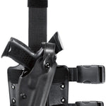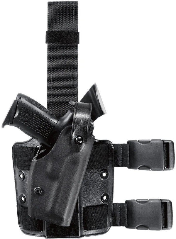 This tactical holster features the SLS (Self Locking System) rotating hood. With no snap, the SLS allows for a smoother single-motion draw and greater protection against attempted weapon takeaways. The hood can only be released by being simultaneously pushed down and rotated forward and actually becomes more secure when upward force is applied. It is also far less likely to release accidentally than conventional thumb break snaps. Molded sight track and soft SafariSuede protect the gun's sights and finish. The Model 6004 features a standard double leg strap and leg shroud with mounting holes for optional accessories. The rugged STX finish protects the gun against scrapes, scratches and dents.
