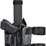 This 6384 open top holster features the Automatic Locking System (ALS), an internal locking device that retains the weapon in all directions with no snaps or straps to manipulate. This holster is optimized for use with a MOLLE vest. Key to comfort and stability are the double leg strap and leg shroud. The leg harness is lightweight and simple to operate. Suede lining helps protect the gun's sights and finish.