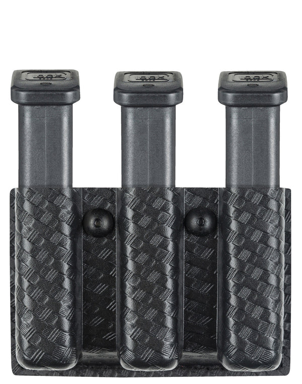 • Provides triple magazine retention without flap in an area comparable to standard dual magazine pouches• Durable SafariLaminate™ thermal-molded construction• Vertical and horizontal belt slots• Magazines are oriented “bullets out” to save space• Fits 2.25" (58mm) belt widths• Part of the 6004/6005 tactical system Model #775-53-48 Fits; AMT HARDBALLER, BERETTA...