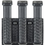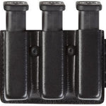 The Model 775 Triple Magazine Pouch is designed to carry three magazines on a 2.25 (58mm) duty belt. The 775 features vertical belt slots. A magazine tension screw located between the two pouches allows for easy retention adjustment. It's constructed of rugged SafariLaminate and is available in several scuff-resistant finishes with four different closures.